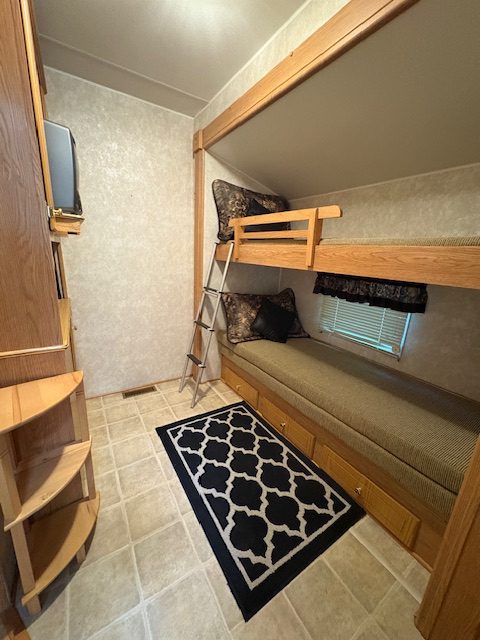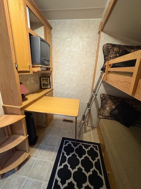 Side bunk room with a single over single bunk bed, (or bottom bunk folds out to a double) and fold down desk option.