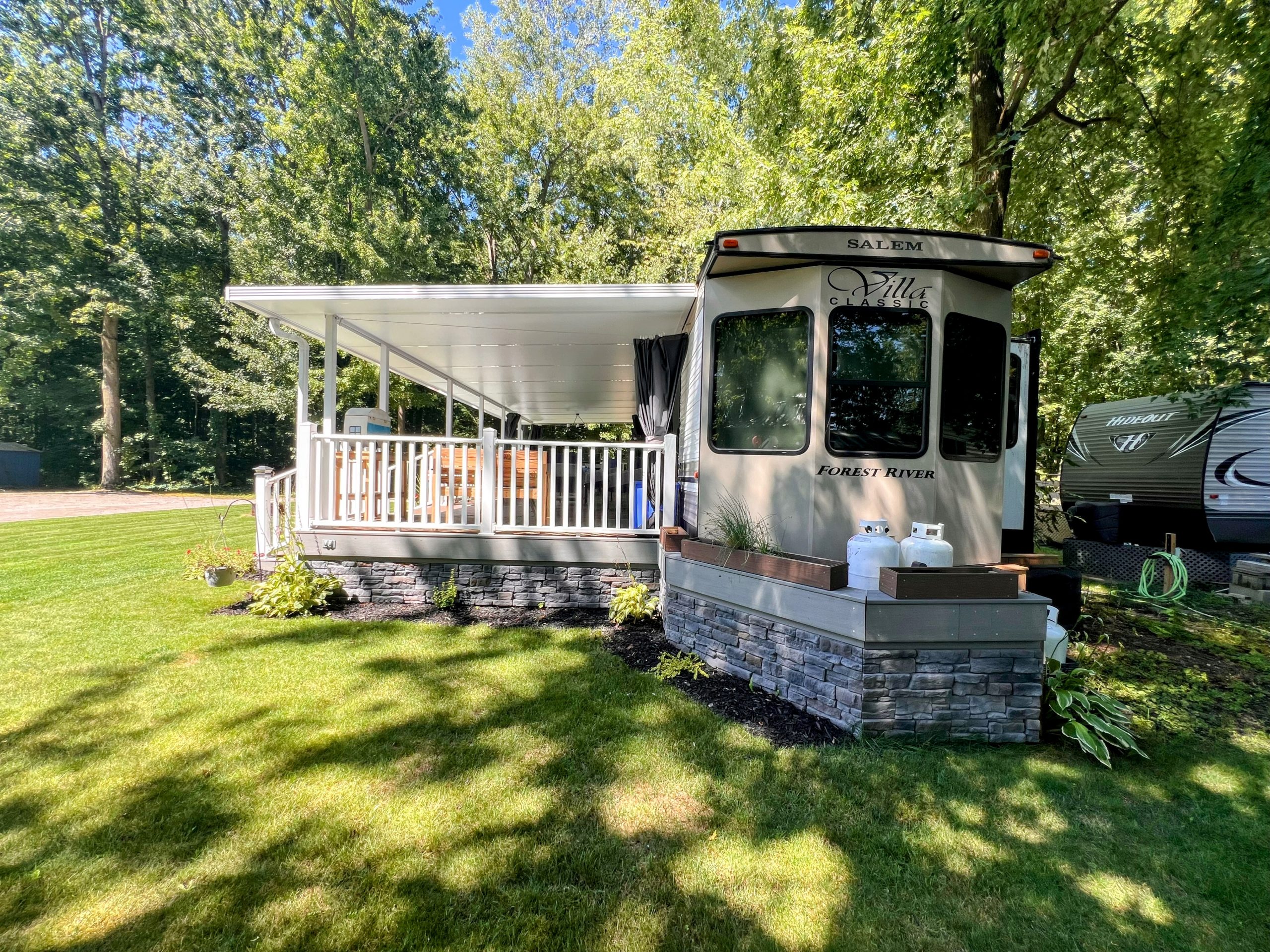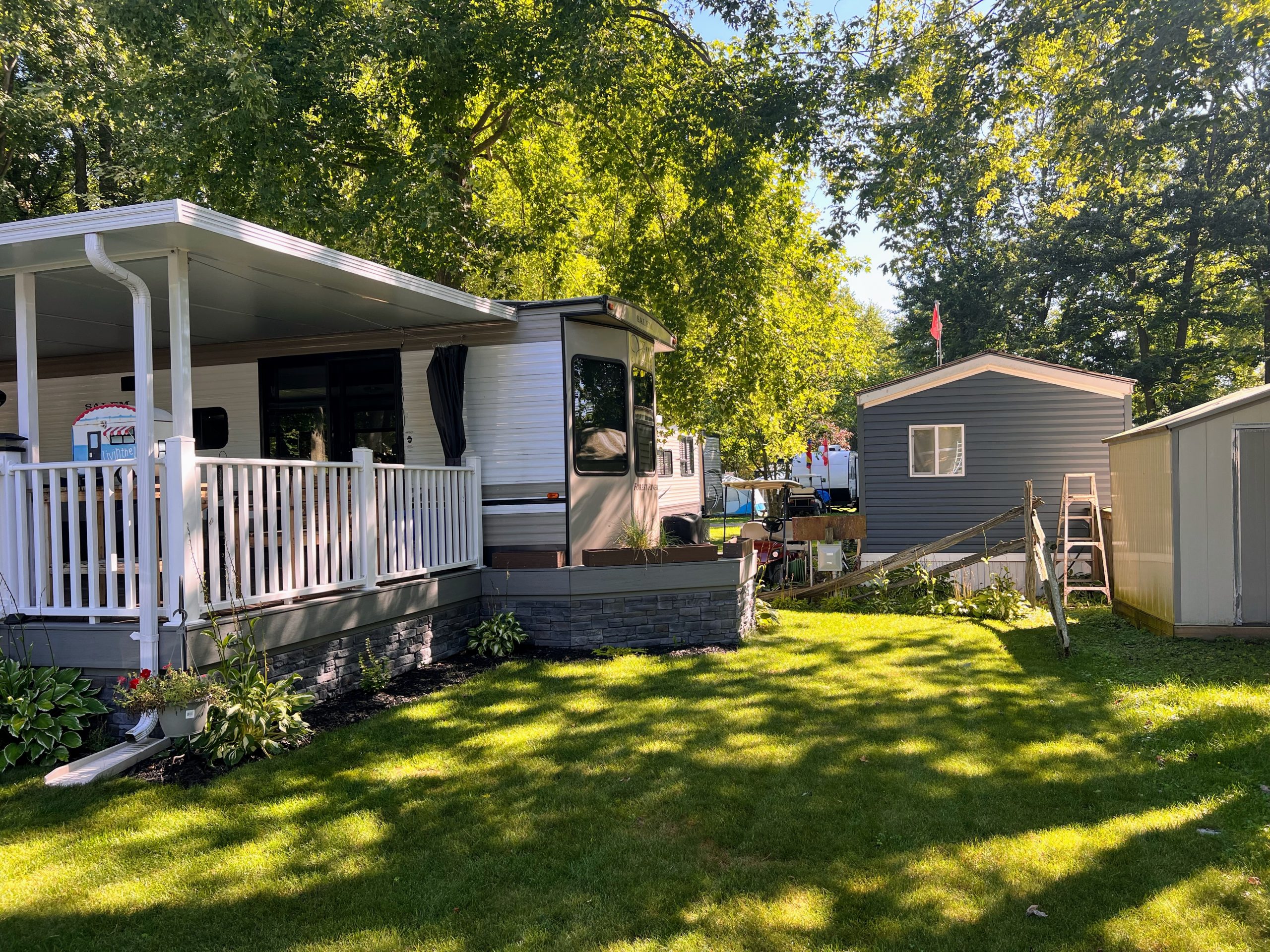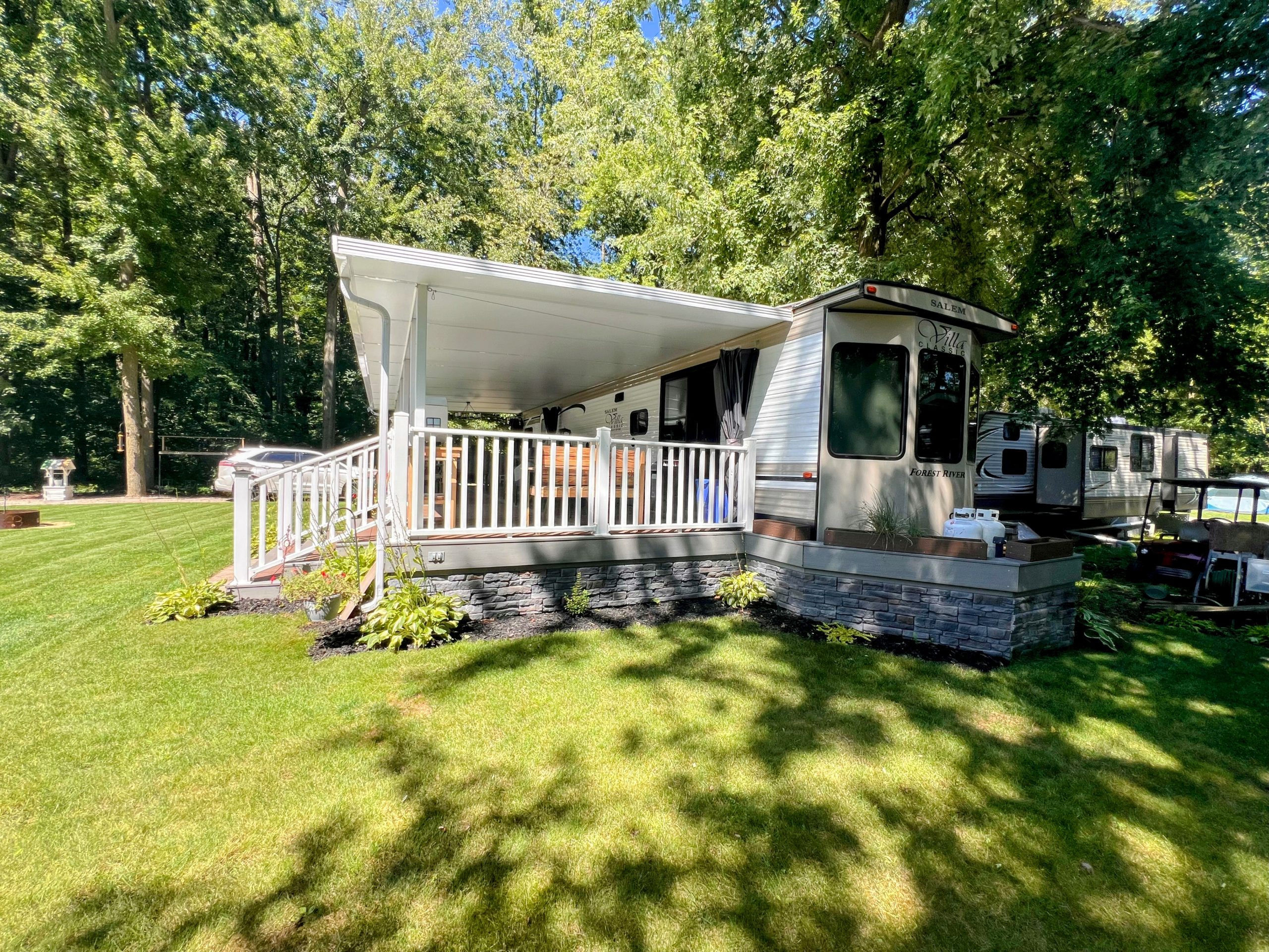 This well-maintained destination trailer is set up on a large, private site nestled beneath a peaceful tree canopy at Windmill Family Campground.