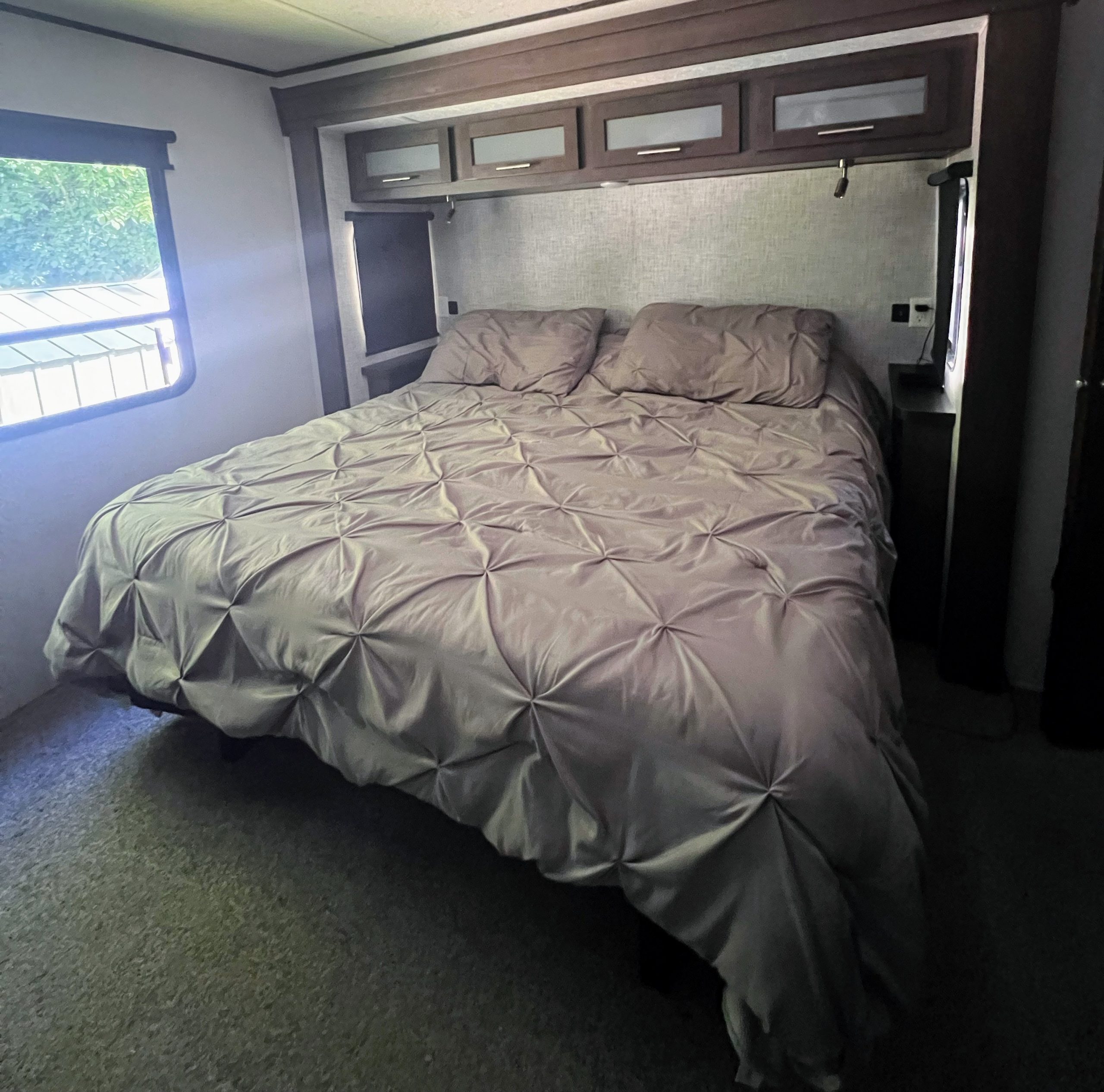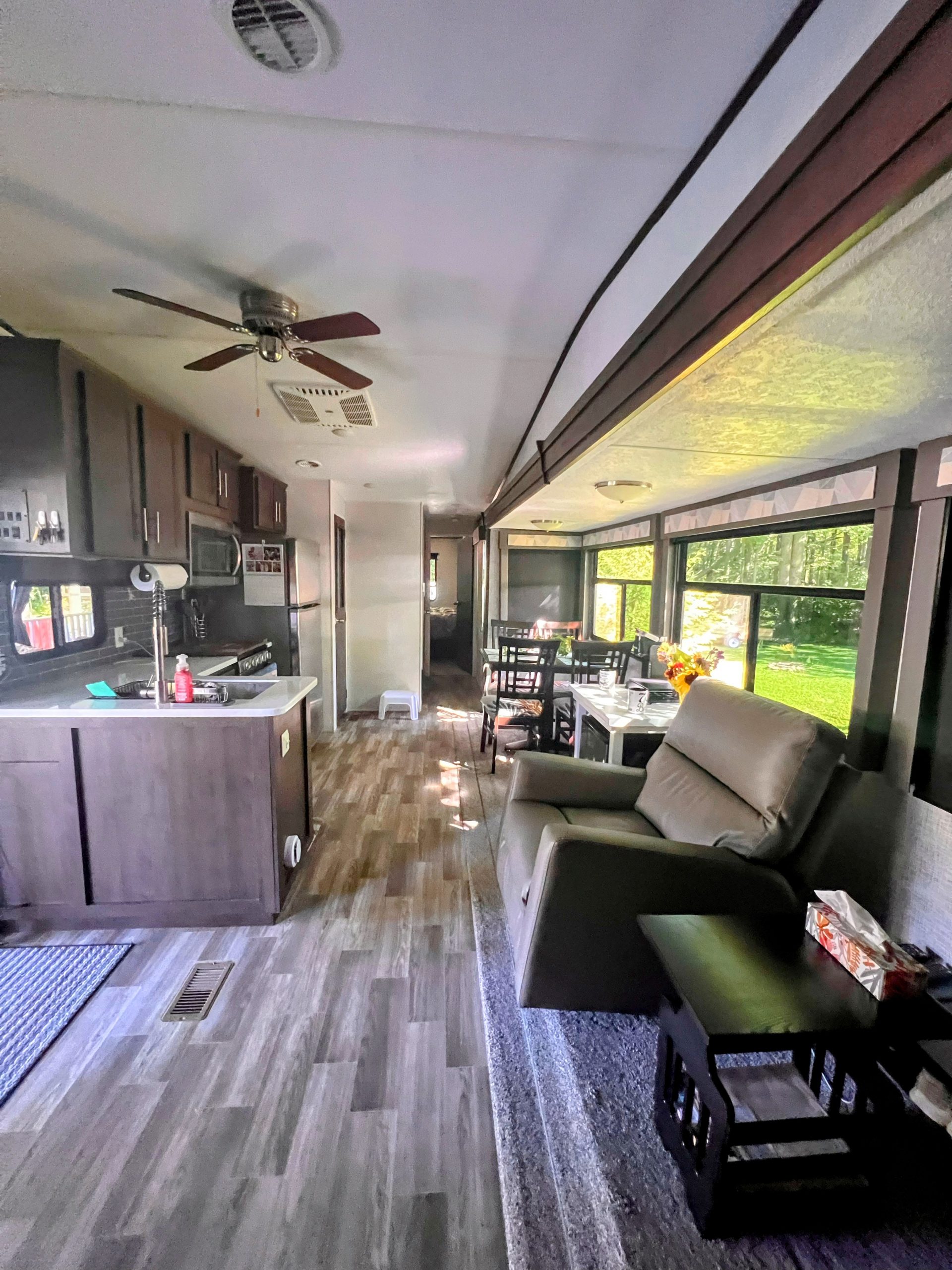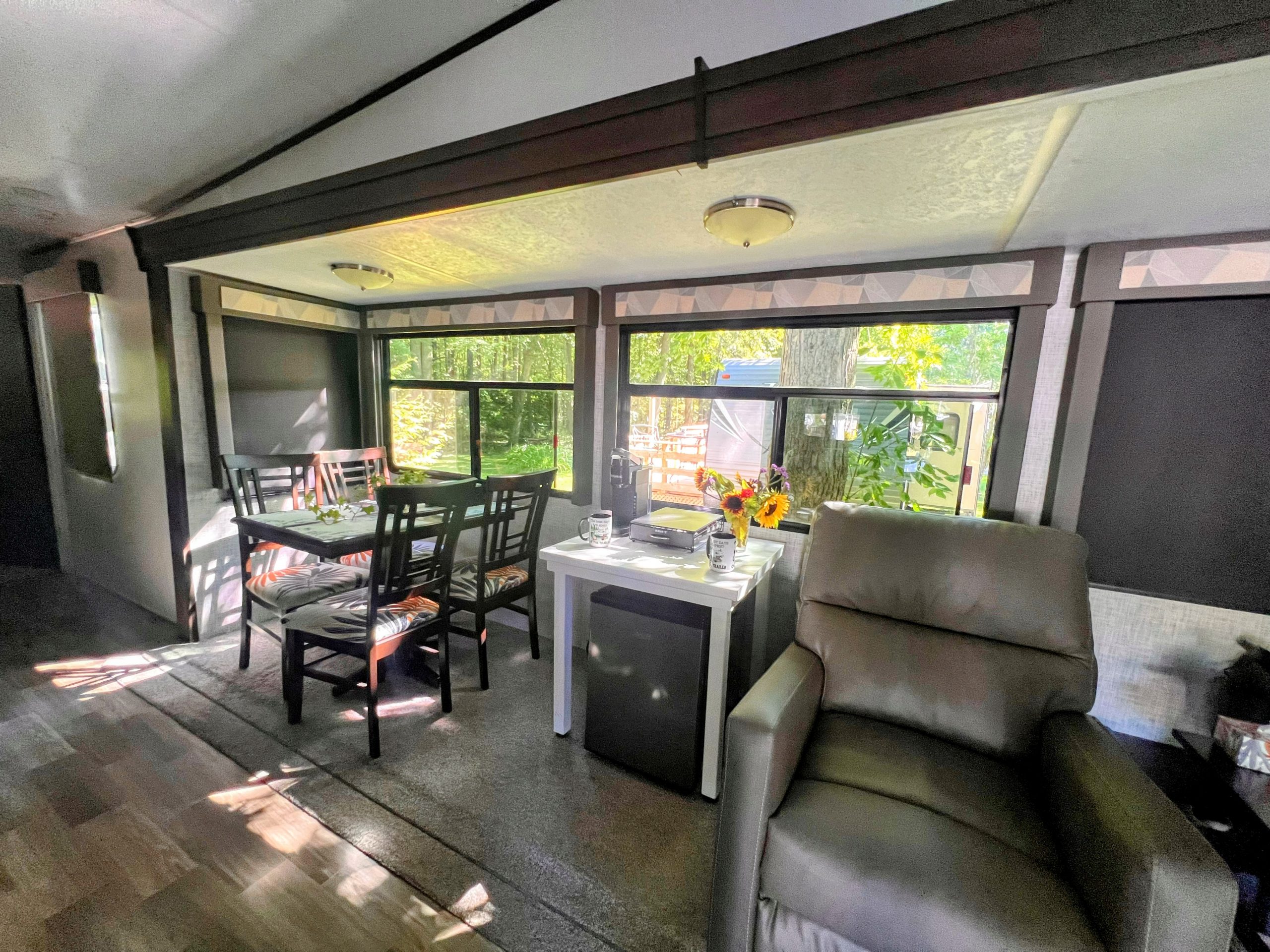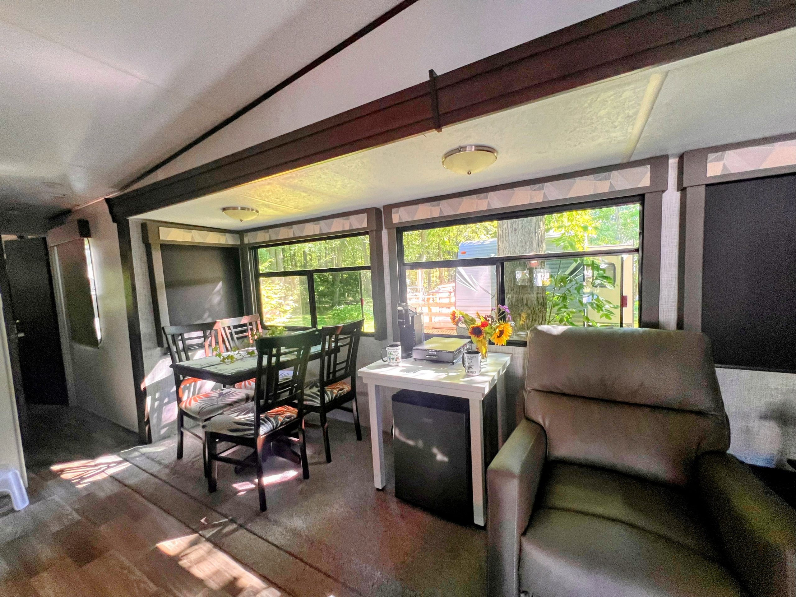 This well-maintained destination trailer is set up on a large, private site nestled beneath a peaceful tree canopy at Windmill Family Campground.